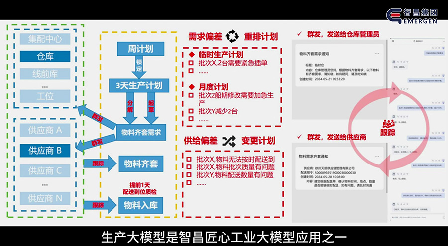 在物料齐套环节,智昌集团部署基于智昌匠心工业大模型的智能体工作流,替代传统人工的信息汇总、供应商沟通及物流跟踪等复杂操作,结合RPA技术实现全流程自动化,显著提升齐套率并降低人力成本。