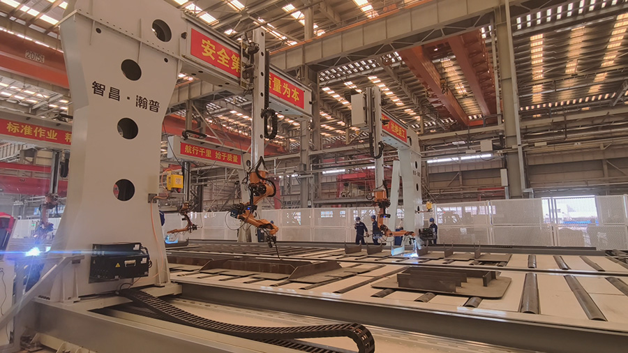 以数据驱动为核心,智昌集团为船舶行业构建了涵盖智能焊接、物流、调度与决策支持的一体化系统。智能焊接部分采用具备3D视觉智能机器人,实现对焊缝的自动识别与高精度路径规划。物流系统通过多台重载RGV与桁车协同,配合首创的力感仿手翻板机,完成大型工件的自动输送与安全翻转。调度系统与集团生产平台实时对接,驱动信息化分拣与配送机制,应对多品种物料的精准管理。数字孪生平台将物理产线全要素映射至虚拟空间,实现全过程可视化监控与数据联动。此外,基于行业工艺数据训练的工业大模型,为操作人员提供实时辅助,推动知识经验的结构化沉淀与传承。